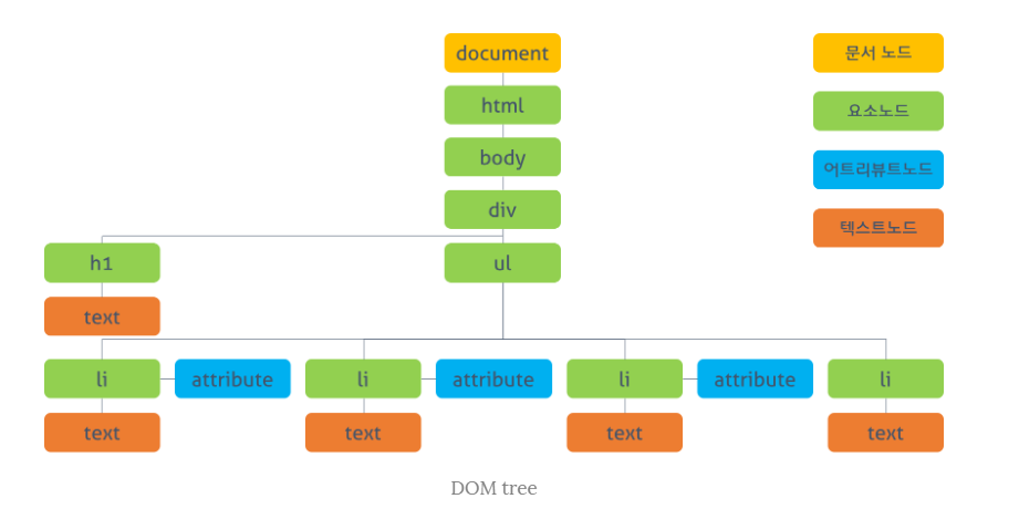 문서 노드(Document Node) 트리의 최상위에 존재하며 각각 요소, 어트리뷰트, 텍스트 노드에 접근하려면 문서 노드를 통해야 한다. 즉, DOM tree에 접근하기 위한 시작점(entry point)이다. 요소 노드(Element Node) 요소 노드는 HTML 요소를 표현한다. HTML 요소는 중첩에 의해 부자 관계를 가지며 이 부자 관계를 통해 정보를 구조화한다. 따라서 요소 노드는 문서의 구조를 서술한다고 말 할 수 있다. 어트리뷰트, 텍스트 노드에 접근하려면 먼저 요소 노드를 찾아 접근해야 한다. 모든 요소 노드는 요소별 특성을 표현하기 위해 HTMLElement 객체를 상속한 객체로 구성된다. (그림: DOM tree의 객체 구성 참고) 어트리뷰트 노드(Attribute Node) 어트리뷰트 노드는 HTML 요소의 어트리뷰트를 표현한다. 어트리뷰트 노드는 해당 어트리뷰트가 지정된 요소의 자식이 아니라 해당 요소의 일부로 표현된다. 따라서 해당 요소 노드를 찾아 접근하면 어트리뷰트를 참조, 수정할 수 있다. 텍스트 노드(Text Node) 텍스트 노드는 HTML 요소의 텍스트를 표현한다. 텍스트 노드는 요소 노드의 자식이며 자신의 자식 노드를 가질 수 없다. 즉, 텍스트 노드는 DOM tree의 최종단이다. 배운 문법